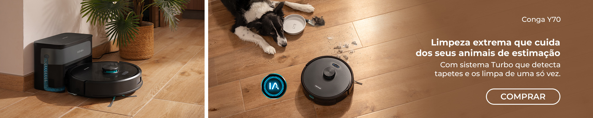 Conga Y70 Robô Aspirador. Navegação a laser. 20000 Pa de pressão de sucção. - de autonomia. Escova de silicone especial para casas com animais de estimação. Base de autovaziamento com saco de pó de 3 L.