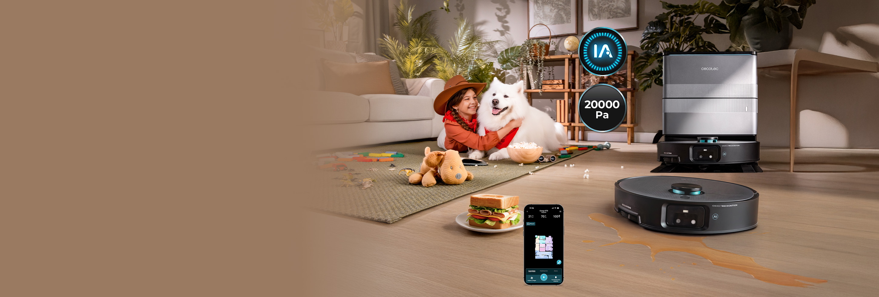 Conga X100 Robot aspirador com sistema de limpeza adaptativa. 20000 Pa de poder de sucção, base 4 em 1 com desinfeção. Inteligência Artificial com câmara. Mopas rotativas eleváveis. Escova lateral e mopa extensível. App com video manager.